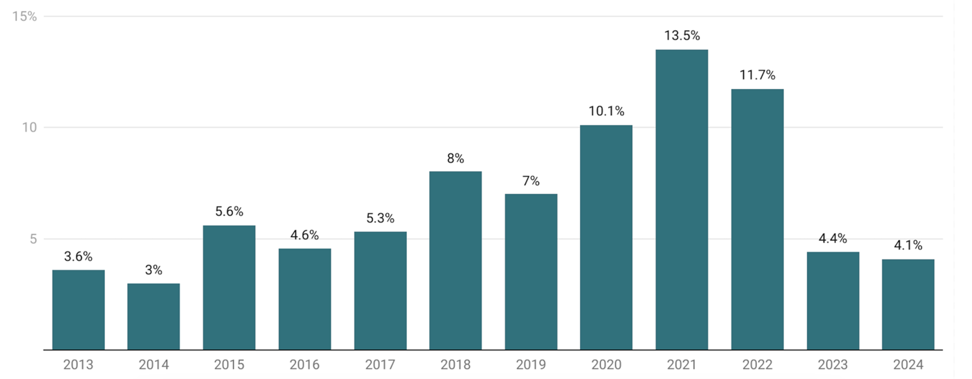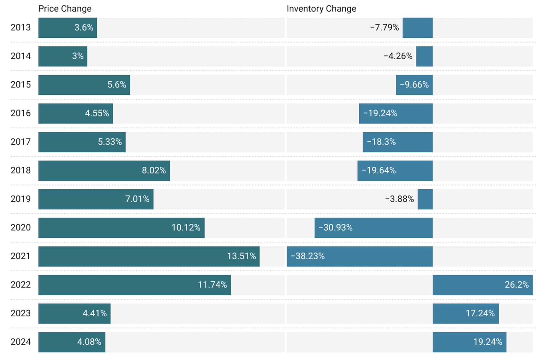 Chart 3 shows how rising prices from 2017 through 2019 coincided with accelerating inventory loss from 2016 heading into 2019 and the hyper-competitive pandemic market. But positive year-over-year inventory trends in 2023 and 2024 are accompanied by annual price growth less than 5%.
