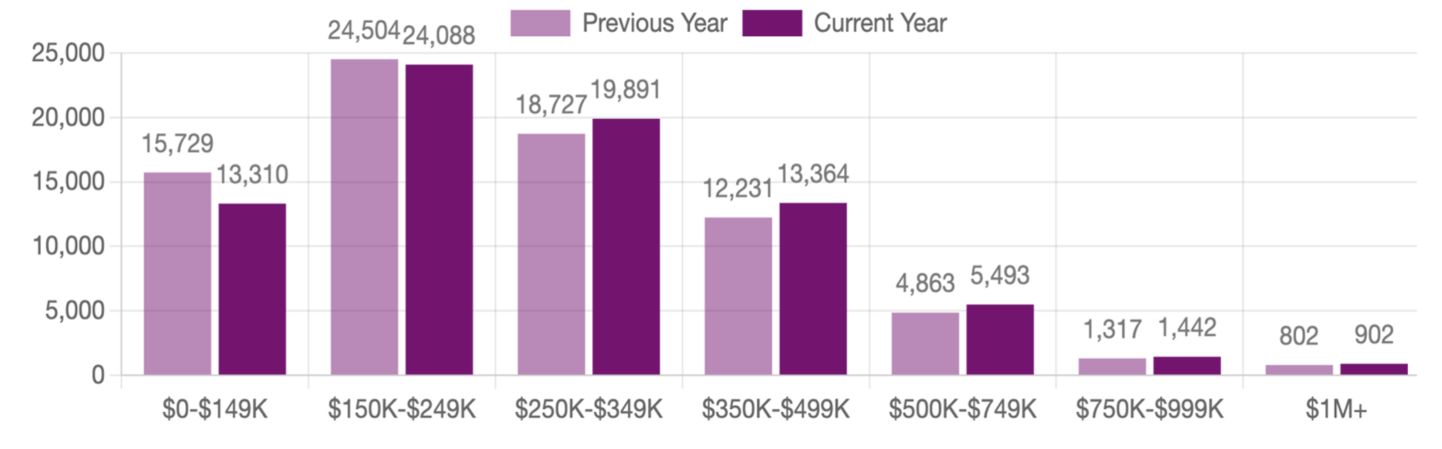 The uptick in year-over-year price appreciation over the past five months isn’t due to uniform rates of increase among price categories, but a larger share of higher-priced sales as closings below $250,000 fell from the previous period.
