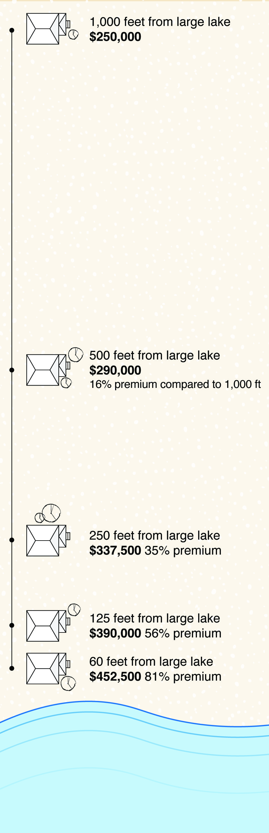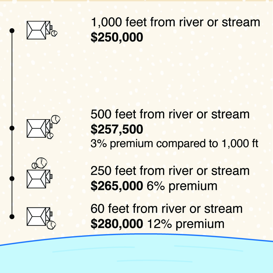 These graphics show how being closer to an amenity can increase a home’s value—even when the home’s size, age, and neighborhood stay the same. For this example, we imagined a home worth $250,000 located 1,000 feet from the amenity.