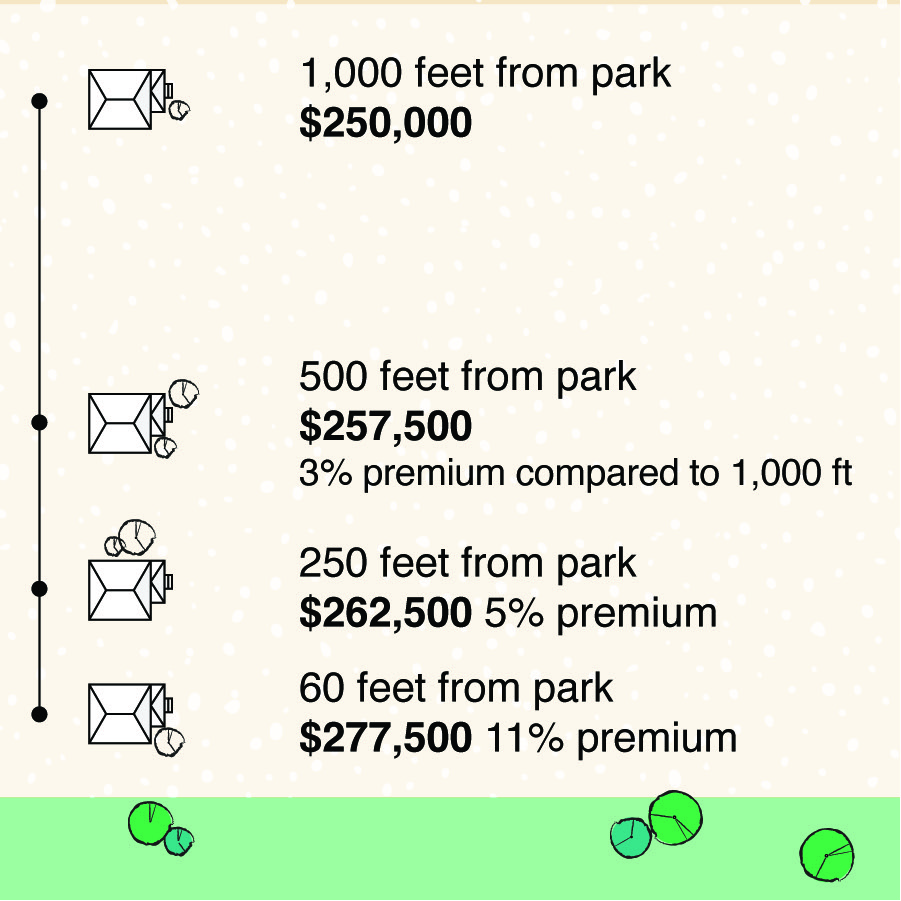 Parks have a similar effect to streams and rivers: 3% increase in value every time you cut the distance to a park in half. Compared to a home 1,000 feet from a park, value will be 3% higher at 500 feet, 5% higher at 250 feet, 8% higher at 125 feet, and 11% higher at about 60 feet.