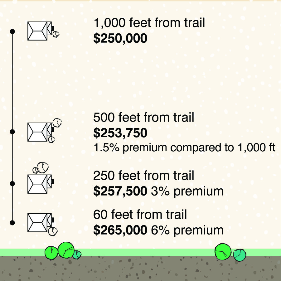Homes within 1,000 feet of a trail have a 1.5% price premium every time that distance is halved, meaning value rises by 3% at 250 feet from a trail and 6% at about 60 feet from a trail. However, this effect varies from trail to trail, which we discuss in the next section.