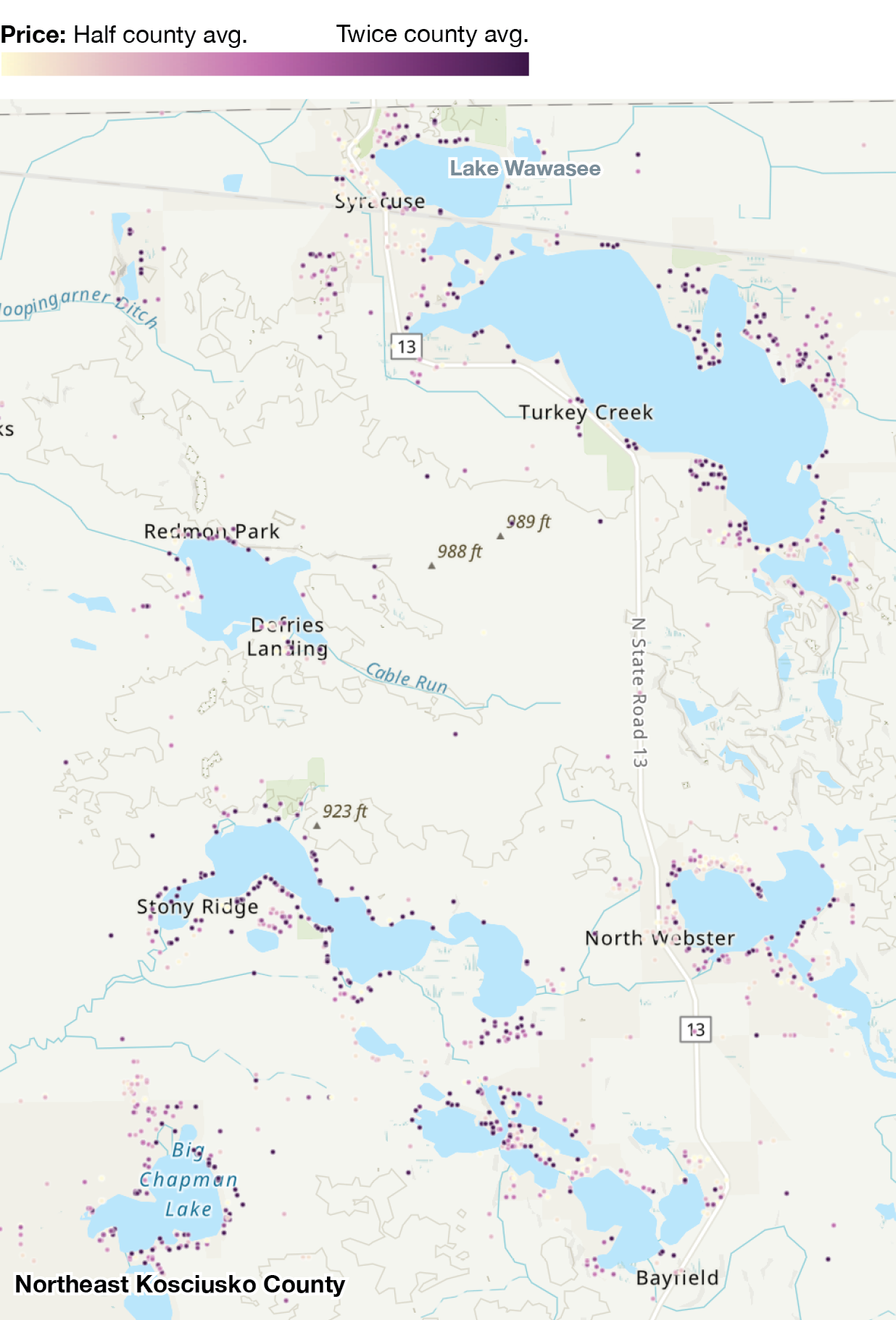 Even small lakes in Kosciusko County add a price bump, and large lakes more than double home prices.