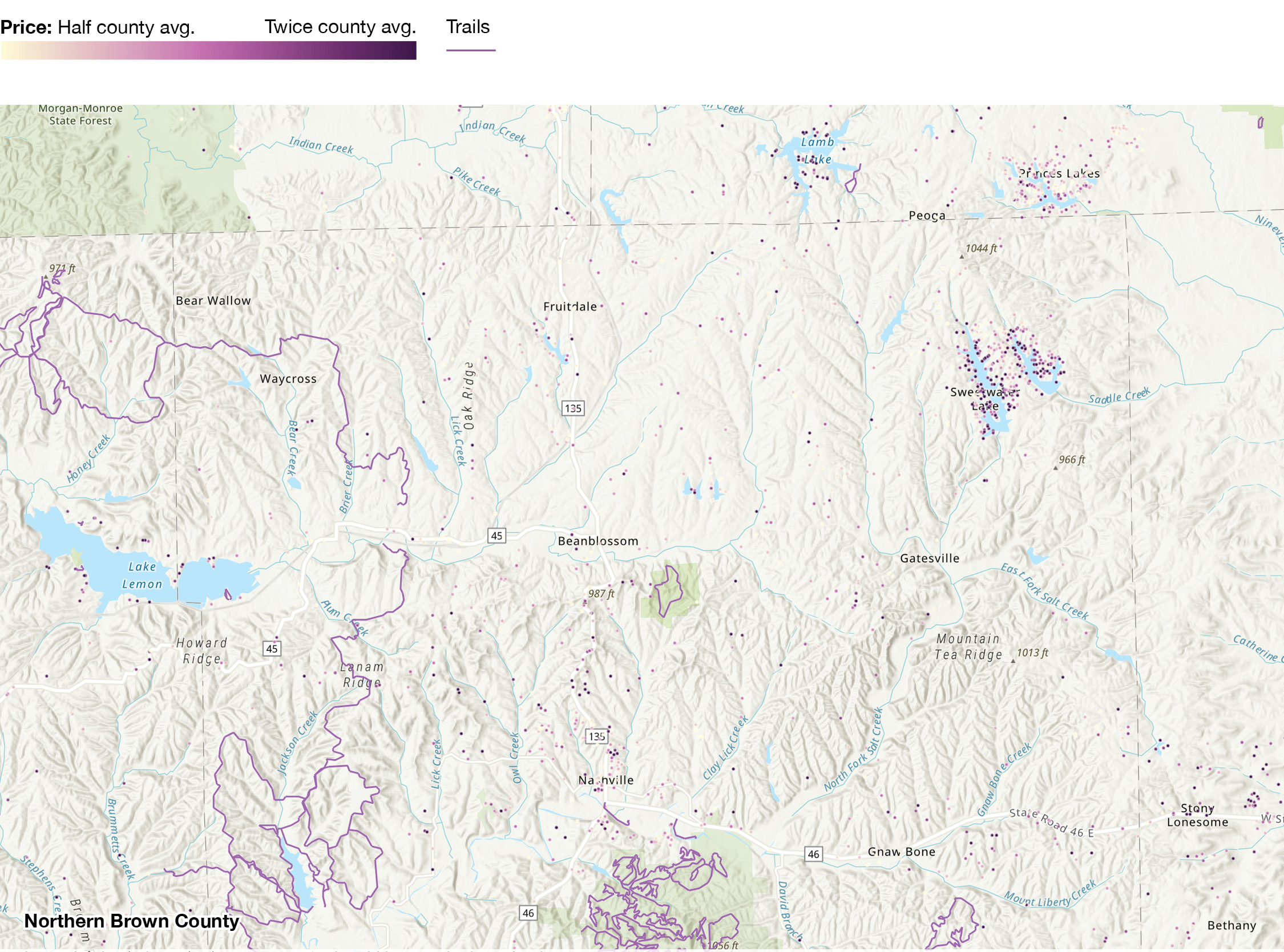 In Brown County, lakes command an even stronger price premium than the state average. Trails and parks, while plentiful in the county, do not show a clear positive relationship with prices—though their presence in the county is certainly a desirable amenity for many residents. Brown County’s medium-sized lakes are Yellowwood Lake (123 acres) and Sweetwater Lake (279 acres). A property on the shore of one of these lakes is estimated to sell for three times the price of an equivalent propety 1,000 feet away (213% price premium). Estimated home price increases by 30-50% each time you halve the distance to the lake. Nearby large lakes include Lake Lemon and Lake Monroe (in Monroe County). These command a premium on par with the state average.