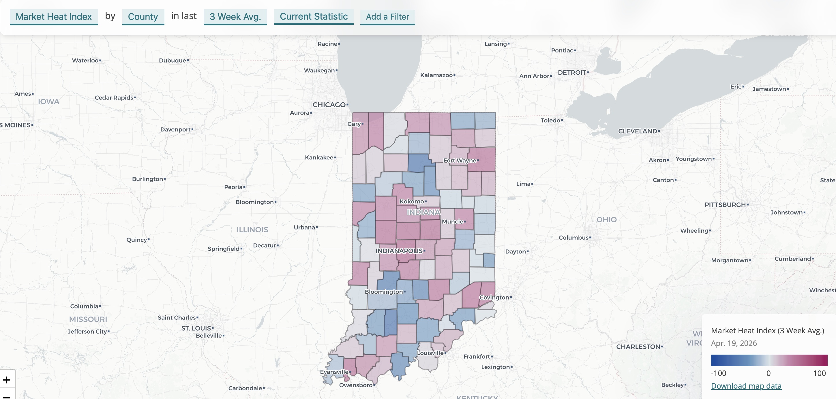 Hendricks, Hamilton, and Boone counties hold the top three spots on IAR's Market Heat Index this week, all scoring above 45 out of 100. The index combines three factors for each county: days on market, sale-to-list price ratio, and the ratio of new pendings to new listings over the past three weeks. A higher score means faster sales, stronger offers, and demand that's keeping pace with incoming supply.