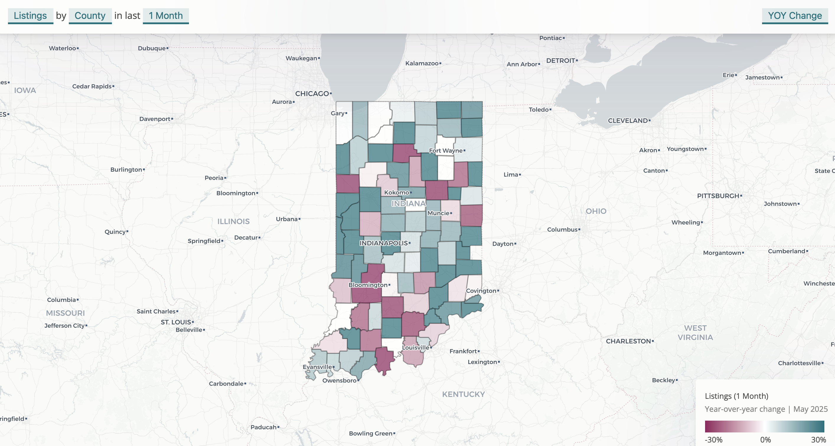 Growth in listings was widespread. Indiana saw 8% year-over-year growth in May, and 58 counties also saw positive growth. Growth was positive across urban, suburban, and rural areas. In fact, the five counties with the fastest listing growth are all smaller communities.