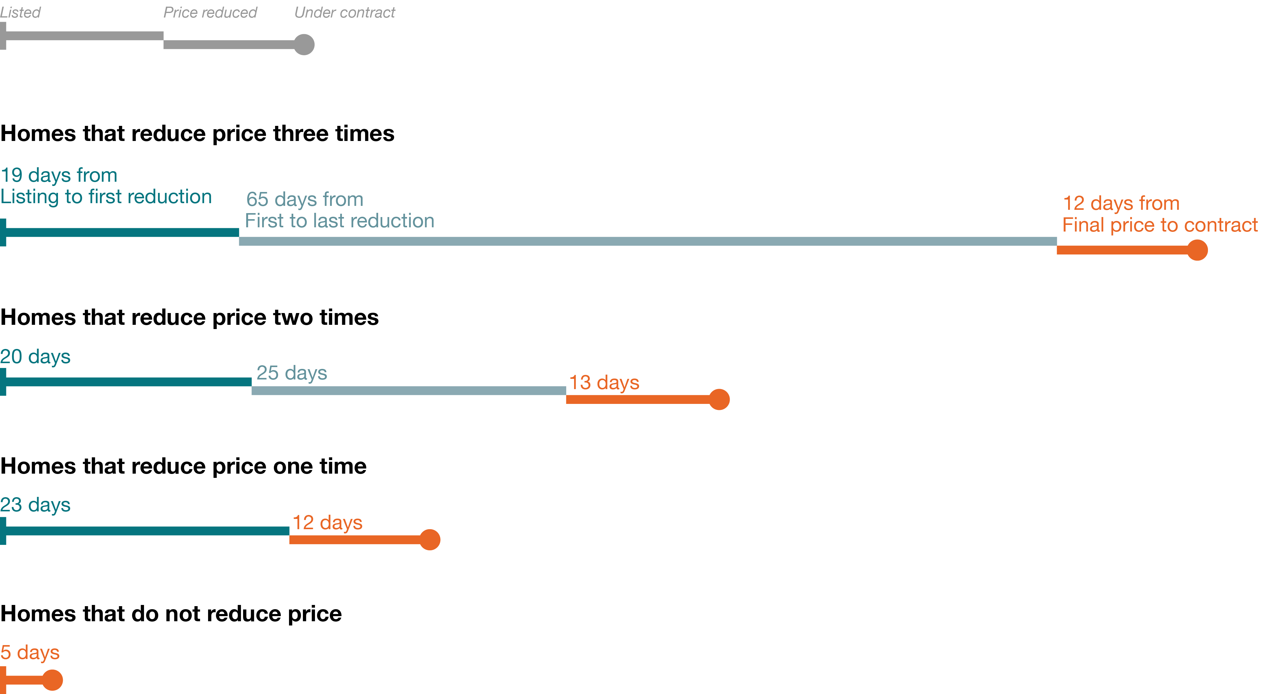 Homes that reduce their price end up on the market for several weeks longer than homes that are priced correctly from the start. For homes with one price reduction, the process typically goes something like this: The home is listed—typically at 3-11% above the ultimate selling price. These homes spend a median of 23 days on the market at the original price before sellers decide on a price reduction. After the price drop, the home is under contract in 12 days. For homes without a price drop, the median time before they are under contract is only five days.
