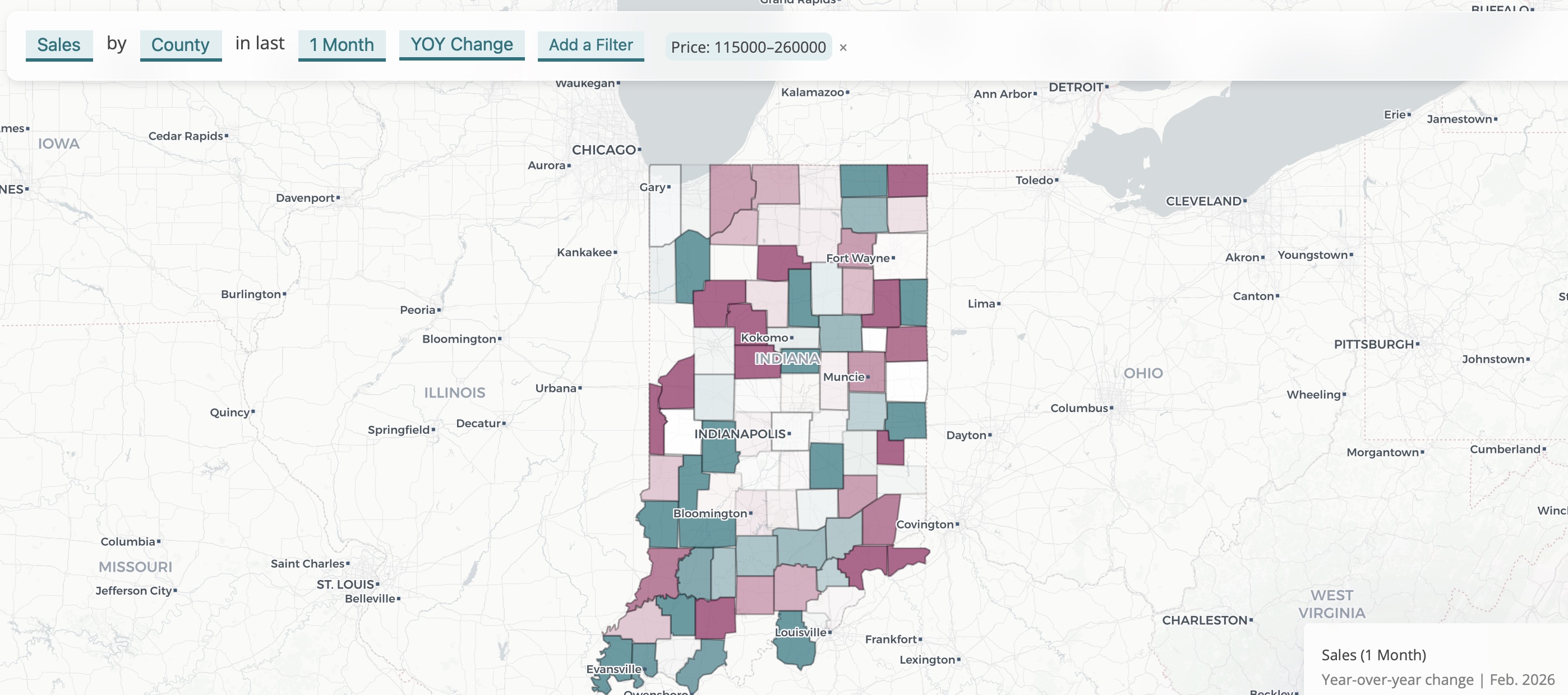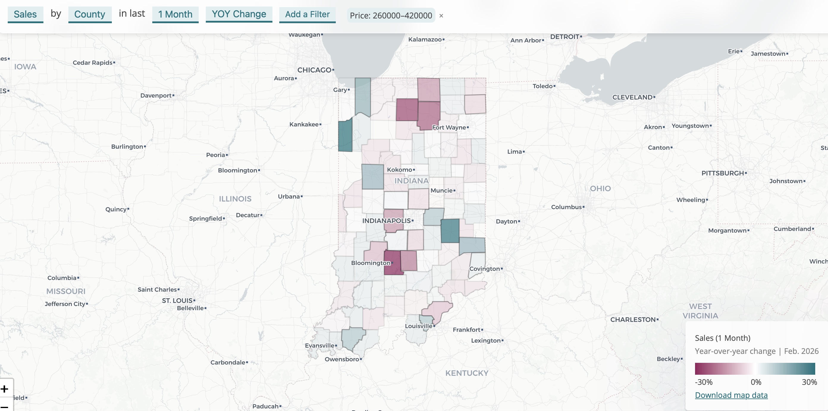 In February, sales dipped 1% year-over-year, but the story is different for Indiana's most affordable counties. Counties with a median sale price under lower than the state median ($260,000) experience 1% sales growth. Counties with higher prices than the state median saw sales contract by 4%.